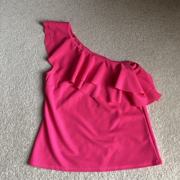 Stylish one-shoulder top with ruffle detail. Vibrant pink color. Perfect for casual outings. Worm once - smoke free home.