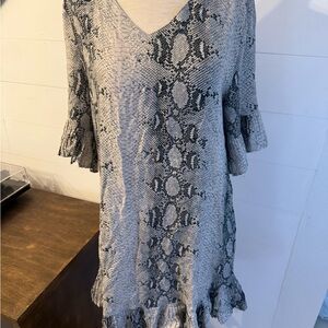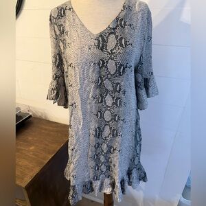 V-neck snakeskin print dress with ruffle hem. 18" pit to pit, 31" long. Good used condition.
