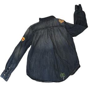 Introducing the Joe Fresh denim button-down shirt - a stylish must-have for the fashion-forward woman! Crafted from premium 100% cotton, this medium-sized shirt features intricate embroidered patches including a bumblebee, heart planet, palm tree, and Sgt stripes. Embrace the perfect blend of comfort, trendiness, and unique design with this captivating piece from Joe Fresh!