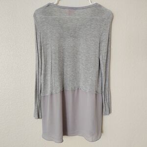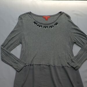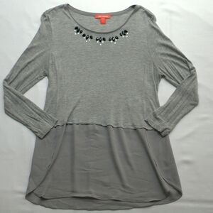 Darling jeweled neck blouse with sheer layering effect at the bottom of the shirt. I am 5'9" and this hits just at the right spot. Would look darling with black leggings for a relaxed look or black slacks/skirt for a more upgraded look! The sleeves were a little short on me so I usually pushed them up to be 3/4 length.