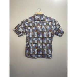 Made with 100% cotton and a woven fabric type, this shirt is comfortable and breathable. The shirt's pattern includes Tiki, Hawaiian, tropical, sun, banana, and fruit, making it a unique addition to any wardrobe. The shirt is a size small and is perfect for any man looking to add a touch of Hawaiian style to their outfit.