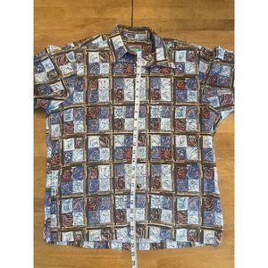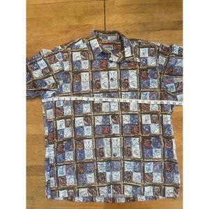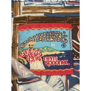 This Joe Kealoha's Reyn Spooner Hawaiian Tiki cotton shirt is perfect for any casual occasion. With a relaxed fit and short sleeves, it features a button closure and collared neckline. The blue, red, white, and brown color combination gives off a tropical vibe, making it ideal for a beach or resort-themed event.