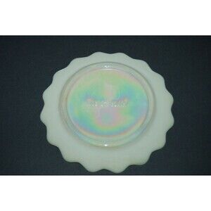 The product is a vintage 1976 Joe St. Clair Uranium Reactive glass plate from the Festival Elwood Indiana event. This collector plate is a 5 1/2" diameter piece made in America. The iridescent white glass plate features a unique uranium reactive property, making it a desirable decorative collectible for those interested in American culture and vintage items. Front says Glass Festival Elwood, Indiana 1776 - 1976 and is dated July 1-4, 1976. The back is marked Joe St. Clair.