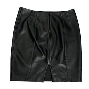 A classic element for your wardrobe, this high-quality leather skirt should hit a few inches above the knee, depending on your height, of course. Hidden zipper closure on the back. Two front seams and two back seams for a more tailored look. Approx measurements, 14.5” across waist, 18” long down the front center, 4.5” back slit. Gently worn, no apparent flaws.