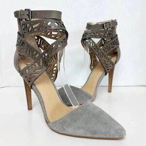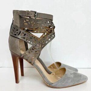 ▪️ Gray Suede Pointed Toe D’Orsay Stiletto Heel with Cut Out Detailing - Adjustable ankle strap with buckle - Heel zip closure
