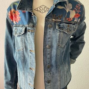 Happy. Eye catching. Denim jacket. Preloved but great condition. Intentionally slightly distressed.See photos.