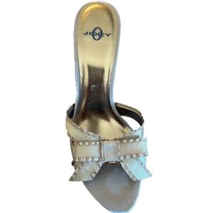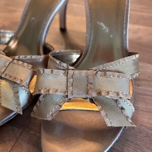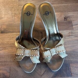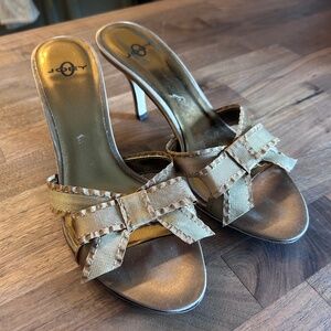 Made from a beautiful ribbon design in a rich gold, with leather insole and rubber outsole for excellent stability and comfort, these are timeless and elegant. Heel is just over 2”, so they are quite comfortable to wear for a long period.