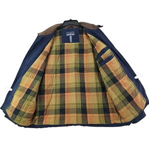 Elevate your style with this designer John Ashford Adventure jacket, perfect for any occasion. Made from 100% cotton, this long bomber jacket features a full zip closure with accents of a zipper and a collared neckline. The navy blue color and vintage design give it a unique touch, while the down insulation material keeps you warm during the winter, fall, and spring seasons.