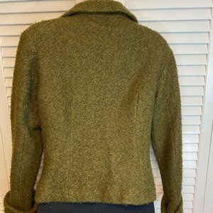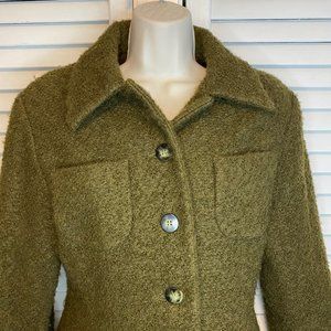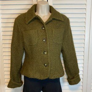 Olive green lined wool blend blazer, button front, chest pockets, pit to pit 19”, length 20”