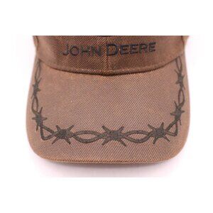 JOHN DEERE Embroidered Buck Logo Barbed Wire Baseball Cap in a rich brown color. This stylish and durable cap features the iconic John Deere buck logo prominently embroidered on the front, accompanied by the classic John Deere name. The brim is further enhanced with a unique embroidered barbed wire design, adding a touch of rugged, country-inspired flair. On the back, the cap proudly displays "JOHN DEERE COUNTRY" embroidered, further solidifying its authentic branding. This baseball cap is perfect for any John Deere enthusiast, farmer, rancher, or anyone who appreciates quality outdoor apparel. It offers a comfortable and adjustable fit, making it suitable for a wide range of head sizes. Whether you're working outdoors, heading to a casual event, or simply want to showcase your passion for the John Deere brand, this cap is an excellent choice.
