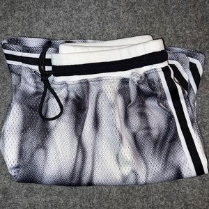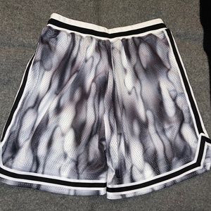 Relaxed fit mesh basketball shorts in a custom 'Smokescreen' print. Two pocket styling with a ribbed drawstring waist and knit striped trim with vented cuffs. Fully lined. Item comes from a smoke-free home.