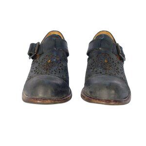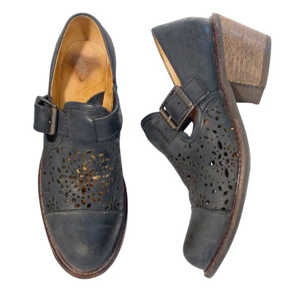 The Adriana Roxana has an adjustable strap and buckle, rubber soles, and a 2" leather wrapped heel, a rugged shoe ready for action while still looking adorable. With a slightly Western appearance, the custom perforations bring a delicate airiness. Leather insole and lining. Rubber sole. Cap toe. Stacked block heel. Made in Portugal. Discontinued - no longer available at Fluevog.