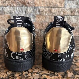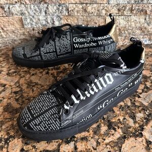 Fashion-forward sneakers with a fun newspaper print and metallic accents.