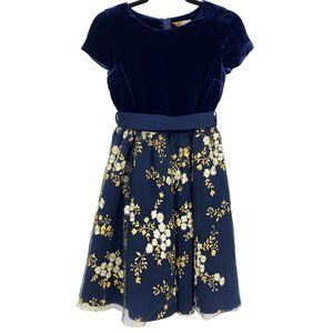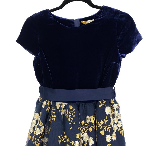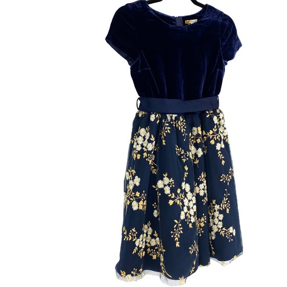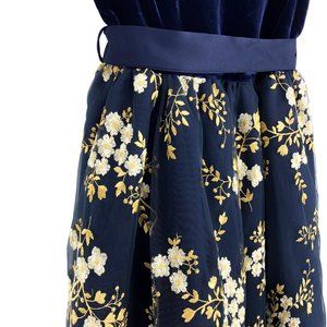 Description: The Heirloom Collection by John Lewis consist of a beautiful blend of styles from velvet to floral embroidery. This navy dress has a velvet bodice with capped sleeves for the upper body. On the lower, the dress has a duchess satin removable sash along with single loop on each side. The skirt on this Heirloom dress has an all over floral embroidery on the netting with lining skirt and additional layer lining + netting. This lovely dress will be perfect for formal and dinner parties, recitals, and other formal events.