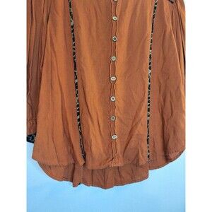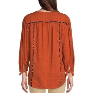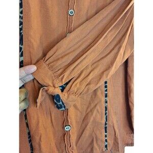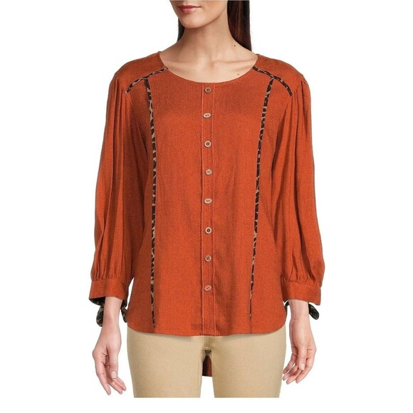 The JOHN MARK Popover Top is a women's size large blouse featuring an animal print trim, perfect for a coastal or boho look. Made from lightweight rayon fabric, this flowy top is ideal for summer, fall, and spring seasons. The round neckline, pullover closure, and 3/4 balloon sleeves add stylish accents, while the multicolor design with western, beach, and hippie themes make it a versatile and breathable option for casual, travel, or workwear occasions. The relaxed fit and easy care instructions make this top a convenient and comfortable choice for everyday wear. PTP 23 in. Length 27 in.