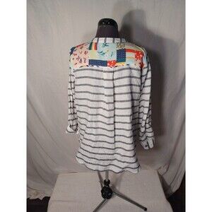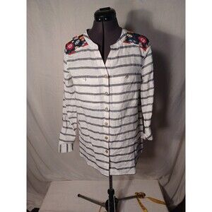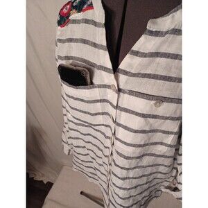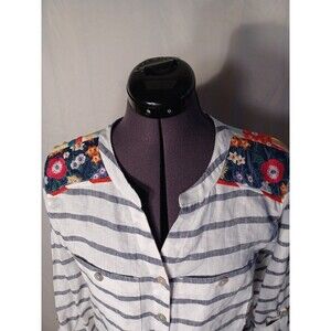 Brand new without tags John Mark small button up shirt linen white blue striped floral, 100 % linen, front 50 % rayon 50 % polyester. back yoke 100 % polyester. size 0X