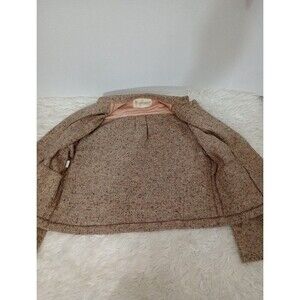 This is a vintage-inspired John Meyer women's blazer in a tan tweed look, featuring a peak lapel style and three-button sleeve detail. The blazer is lined, has a single-breasted cut with a one-button front, and is designed in a short length. It is a size 14, suitable for various occasions from formal to workwear. The jacket is ideal for winter, summer, fall, and spring seasons, adding a touch of 80's style to your wardrobe.
