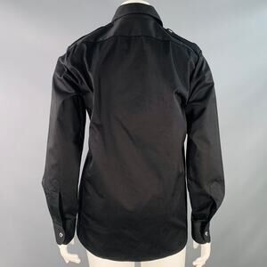 JOHN RICHMOND long sleeve shirt in a black cotton stretch blend fabric featuring two buttoned pockets with silver tone metal studded stars, spread collar, and button closure.