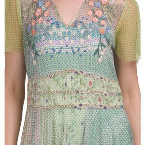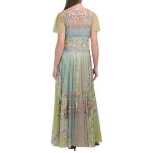 printed mesh overlay, embroidered floral detail, ruched waist, detachable printed slip with adjustable