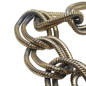 John Wind designer retired goldtoned double link chain bracelet. This lightweight comfortable bracelet has hollow links and ribbed design on the surface.  Bracelet measures 8-3/4 inches long and 1-1/4 inches wide.  Bracelet is in overall very good condition with some of the goldtoned surface having rubbed off where the links interlock at exposing the silvertoned base metal.