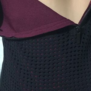 Beautiful black lace dress with maroon fabric underneath. Tight form fitting dress Really sexy! This dress is well made and that is reflected in the weight of the fabric. Very nice. Zips up the back.