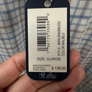 Featuring a Malibu Blue plaid pattern, button-front closure, long sleeves with adjustable cuffs, and dual chest pockets. Retail price: $138.