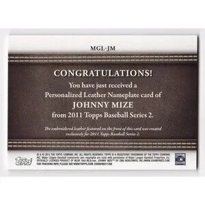 JOHNNY MIZE 2011 Topps Manufactured Leather Nameplate # MGL-JM HOF+2009 #LGU25