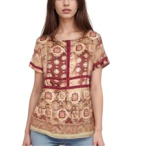 AS IS 🚨 JOHNNY WAS • Short Sleeve Concealed Snap Button Popover Bandana Abstract Artsy Print Blouse. Mixed Media velvet trim