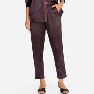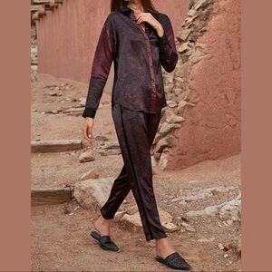 Gently used condition! Gorgeous satin printed tuxedo pants by Johnny Was. Black velvet tuxedo stripe down sides. Elastic waist with tie. Side pockets.