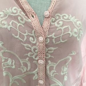 THIS BEAUTIFULY DETAILED BLOUSE. SLEEVE ARE IN CREDIBLE AND THE DETAIL ON THE BACK IS GREAT, THIS TIES ON THE BOTTOM SO IT CAN WORK FOR SHORT PEOPLE AS WELL AS TALL. YOU CAN TAKE THE PULL OUT TO MAKE IT A TUNIC IF YOU LIKE.ADORABLE SHIRT HAS TONS OF PRETTY EMBROIDERY.