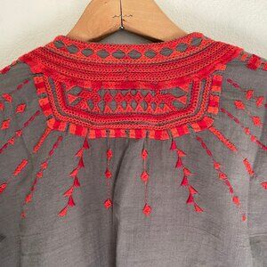 JOHNNY WAS Biya Grey Cotton Top with Red Embroidery: Size XS (Runs Large): P2P is 20 3/4's Inches.