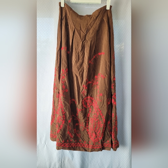 JOHNNY WAS Brown Red Embroidered Cotton Silk Side Zip Skirt Womens Sz XS