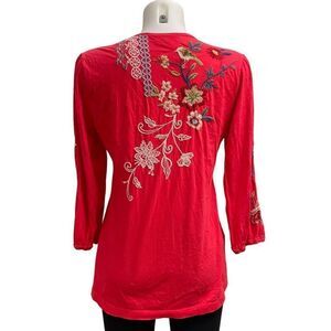 JOHNNY WAS Ellia Puff Sleeve Tee , tangerine front back embroidered size