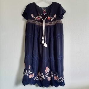 JOHNNY WAS Embroidered BOHO Peasant Dress, Navy Blue with Royal Blue and Multi-Color Embroidered Bouquet Flowers, Short Flutter Sleeves, Tassel Embellished Tie V-Neckline, Empire Waist, and Embroidered Scalloped Hemline. Fabric is 100% Cupra Rayon (cotton blend) that has a beautiful sheen, soft silky feel, luxurious drape, and is breathable, cotton embellishments.