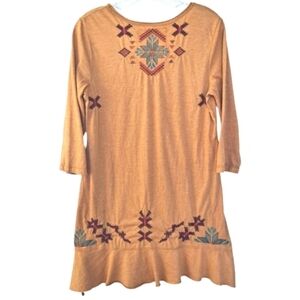 Step into effortless boho style with the JWLA by Johnny Was “Gillian Flounce” Tunic, a rare gem from the Joy Love Light collection. Designed in a rich mustard hue with colorful Southwestern embroidery in teal, rust, and plum, this flattering tunic features a flounce hem, relaxed fit, and ¾ sleeves. The hi-low silhouette flows beautifully for a carefree, artful vibe. Perfect for music festivals, weekend markets, or cozy fall layering—this is bohemian luxury with soul.