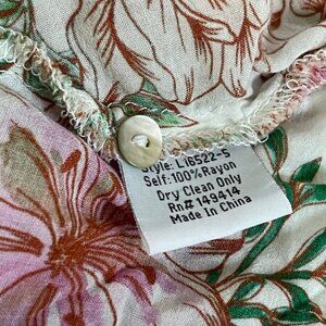 100% Rayon; Batwing Sleeves; Buttons Down the Front and On Cuffs with a Hi/Low Hem.