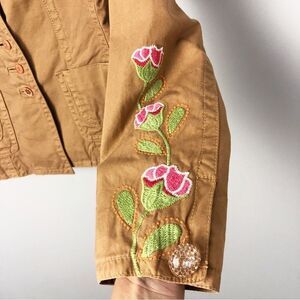 Adorable and intricate blazer by JWLA! Dark tan color base. Three unique buttons on the front to close if you choose to. Beautiful multicolor flowers embroidered throughout. Sleeves are finished with a fun jewel look large button. Tailored fit with flattering back pleating. Excellent condition. Womens size small.