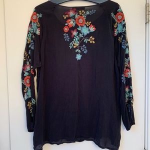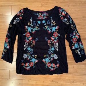 Beautiful Floral Oversized Pullover JOHNNY WAS Embroidered Blouse / Shirt / Top. Tagged Size Medium. In Gently preowned condition, from home clean of smoke and pets. Measurements when laid out flat are: Underarm to underarm 21 1/2", Back of neck to bottom ( front ), Back of neck to bottom ( back ) 24" 26 1/2", Shoulder to bottom along side 27 1/2", neck opening 11", underarm to end of sleeve 17"