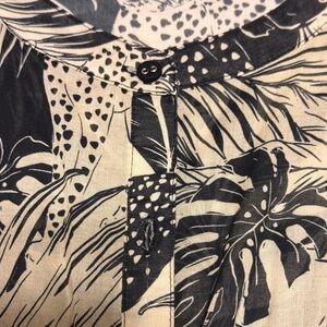 A trendy must-have with a boho-chic look. Ensure your wardrobe shows you off to your best advantage with clothing from Johnny Was. Made from soft cotton, this blouse showcases a contrasting tropical leaf print with a band collar and 3/4 sleeves. It also features a button-front closure and a hem that hits at the hip.