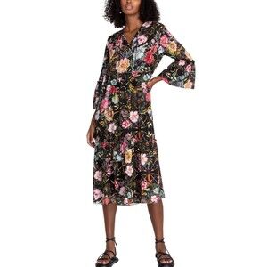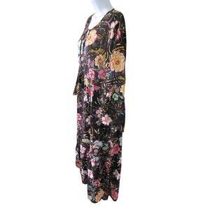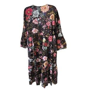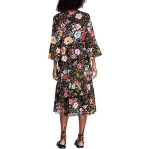 The JOHNNY WAS Peace Ruffle Tiered Midi Dress in Black Floral Print is a shift dress made of 100% cotton. It features a henley neckline, 3/4 bell sleeves, and a button closure. The dress is multicolored and has a floral print, making it suitable for travel, Holy Communion, parties, and casual events. It is machine washable and lightweight. The dress is accented with ruffles and buttons, and it has a peace sign character. The dress is available in size XL and is suitable for women of all ages.