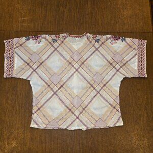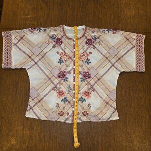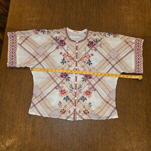 This JOHNNY WAS "Royland" embroidered blouse is made with 100% soft, off-white cotton and is embroidered with flowers and plaid designs in beautiful burgundy and rose shades. It is a size Small, but I wear a medium and it fits me comfortably. I washed it, but never ended up wearing it. The blouse features kimono sleeves that fall just at the elbows. It has a rounded neckline and button closure. Notice the covered buttons! Please see photos for measurements, and feel free to message me with any questions. This comes from a smoke-free home.
