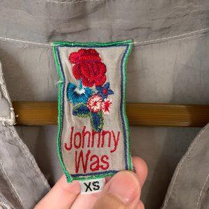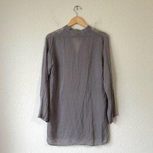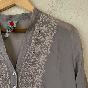 JOHNNY WAS Long Sleeve Sheer Embroidered V-Neck Tunic Blouse Button Gray WMNS XS W5617