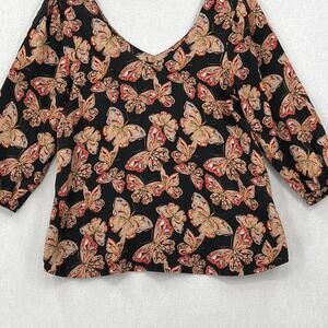 JOHNNY WAS Silk Akil Butterfly Print Top Womens XS Black V Neck 3/4 Puff Sleeve
