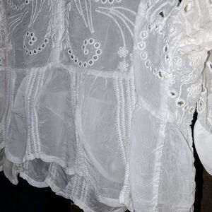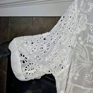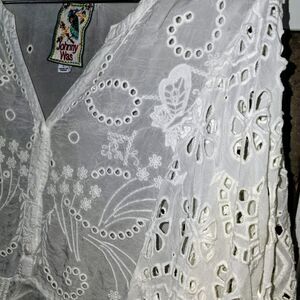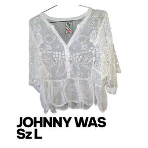 JOHNNY WAS SzL White All Over Heavily Embroided Eyelet S/S Cupro Blouse Boho Top