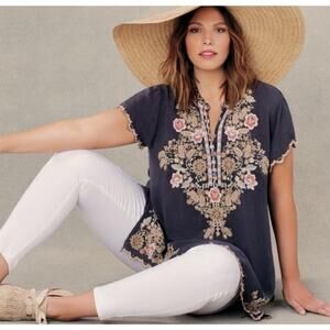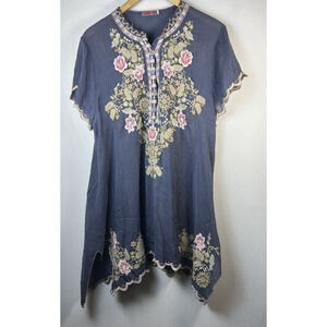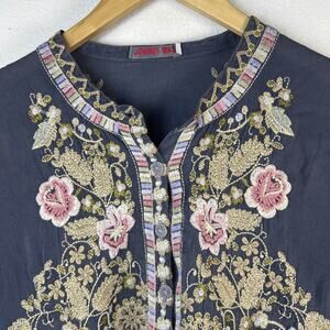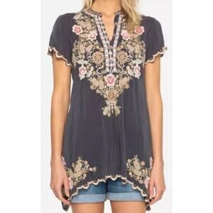 JOHNNY WAS Talum Floral Embroidered Blouse Charcoal Gray Tunic Large Bohemian