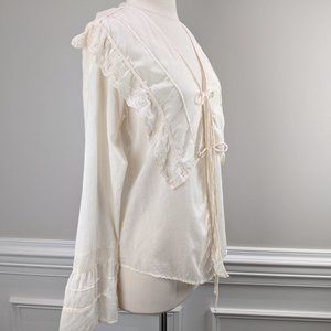 From JOHNNY WAS, the brand that makes beautifully crafted, vintage-inspired clothing for the sophisticated free spirit. This airy & romantic open front blouse features a dual tie closure and embroidered overlay collar. In a lightweight cotton with flared ruffled sleeves. Simply gorgeous!