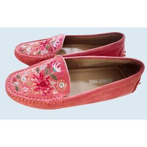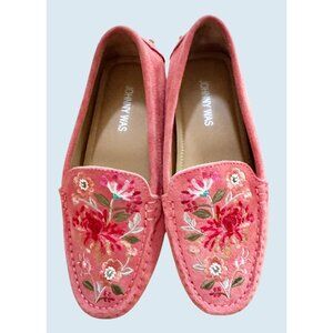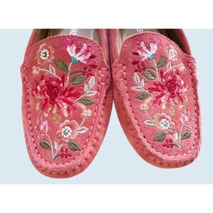 Gorgeous moccasin loafers by Johnny Was. Coral suede. Slip on. Floral embroidery. Rubber peg soles. Size 6. Pre-owned and very gently worn in excellent condition!