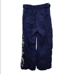 JOHNNY WAS WORKSHOP EMIKA BELTED WIDE LEG PANT Navy Blue BOHEMIAN Embroidered Floral Women's size XS. Excellent pre owned condition. A stray aqua colored stitch on middle of one pant leg. No stains, rips or tears. See pics.