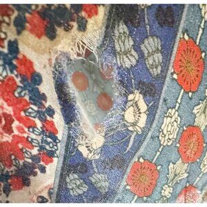 Very pretty top by Johnny Was Workshop. Full button. Gorgeous print. Semi sheer and loose / oversized. Velvet button panel. Viscose with silk, rayon, cotton, spandex. Size small. ** There is a rip in the fabric near the bottom (see photo). It blends into the draping when worn. Item is priced accordingly based on this flaw. Overall, the blouse is in really nice condition with that exception.