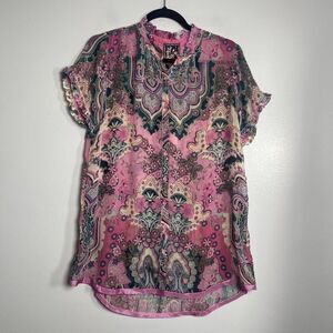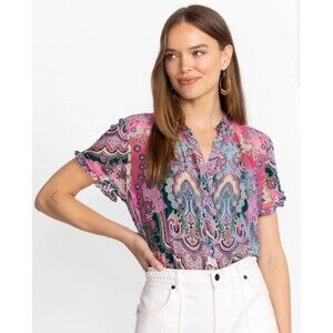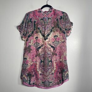 The JOHNNY WAS Zoli Tape Hem Burnout Tunic in Small Pink is a stylish and versatile piece perfect for any occasion. With a paisley pattern, short sleeves, and button closure, this blouse combines bohemian and romantic themes for a chic look. Made from silk and rayon, it offers a comfortable and luxurious feel for everyday wear or special events. This tunic from Johnny Was is sure to make a statement with its designer quality and unique design.